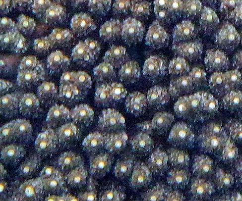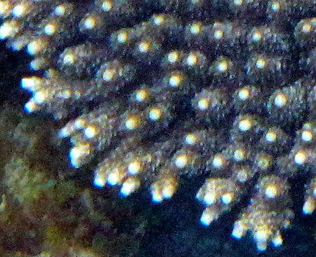 形態特徵: 柔枝軸孔珊瑚 群體呈現厚厚的繖形,分枝規則整齊,分枝寬約7至10公厘,有次生的分枝。緣珊瑚石排列規則,開口呈鼻形或圓形;軸珊瑚石突出2至8公分,有二環隔片。生活群體為乳白或藍色,緣珊瑚石通常顏色較鮮豔。棲息在水深5至15公尺間的珊瑚礁海域。廣泛分佈於印渡洋至太平洋的珊瑚礁區。