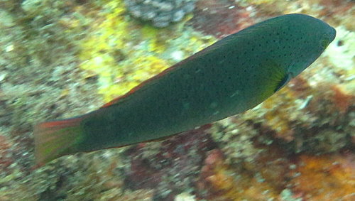 形態特徵: 體延長,側扁。吻較長,尖突。前鼻孔具短管。口小;背鰭硬棘柔弱。幼魚體背側灰黑,體腹側灰白,體側每一鱗片有一黑點而形成點狀列,胸鰭基具一大形黑斑,背鰭前端、中部及尾柄背側各具一黄緣黑眼斑,背鰭臀鰭與體色相同,具多條橘紅色細縱線,胸鰭與腹鰭黃色;尾鰭鰭條橘紅色,鰭膜綠色,鰭上下緣具寬的橘紅緣。雌魚體色偏綠,頰部具淡橙色水平波狀紋,眼斑漸縮小而消失,僅剩背鰭前端及尾柄背側的小黑點,餘同幼魚;雄魚體綠褐色至紅褐色,餘同雌魚。主要棲息於珊瑚礁區,水深在0-30公尺的海域中。白天喜愛在珊瑚礁區活動,夜間會潛伏在沙堆中睡覺。主要以底棲性甲殼類、軟體動物、多毛類、有孔類、小魚及魚卵等為食。具性轉變的行為,是屬於先雌後雄型的型態。台灣各地岩礁海域皆有分布。