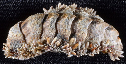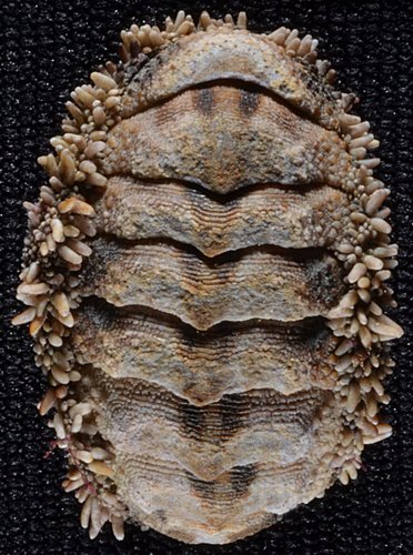 形態特徵: 本種的尾板小而平坦,呈三角形,缺乏齒隙。殼表不規則有顆粒覆蓋。肉帶寬,背面覆有石灰質的短棘。在臺灣產的石鱉當中算是中、大型的種類,體長可超過8公分。棲息於礁岩區潮間帶的石縫或凹洞中。廣泛分布於東亞及東南亞沿海的潮間帶,臺灣本島、各離島,及金門、馬祖各島的礁石海岸潮間帶都常見。採自大安海岸潮間帶礁石。