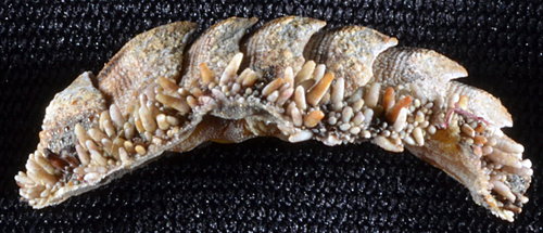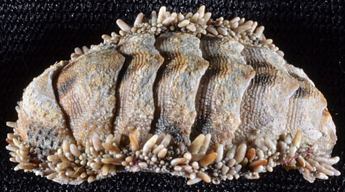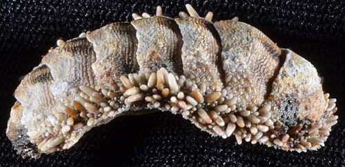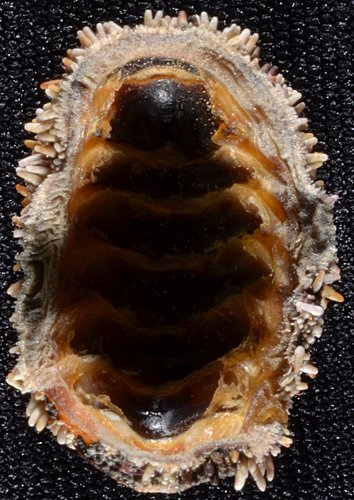 大駝石鱉的肉帶背面密布立起的圓柱形鈍棘,棘尖端為白色,棘的尺寸大多相同。