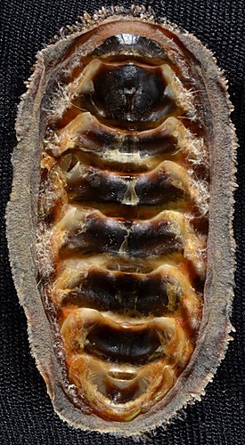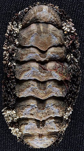 大駝石鱉的殼表不規則有顆粒覆蓋。肉帶寬,背面覆有石灰質的短棘。
