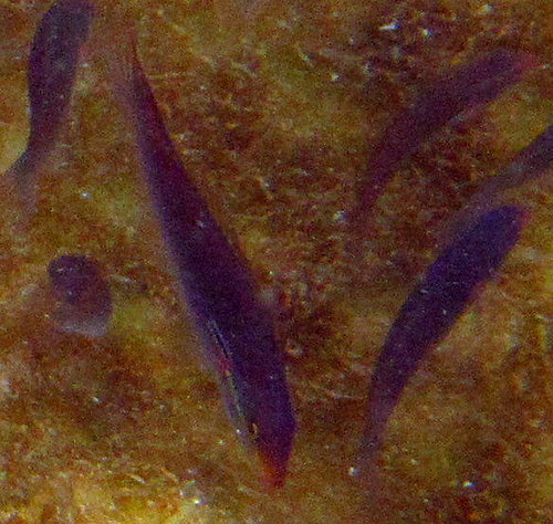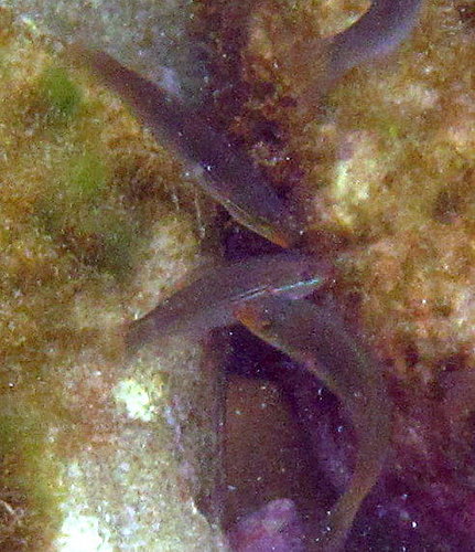 形態特徵: 體長形;頭圓錐狀;鰓膜與峽部相連。雌性體側上半灰褐色,下半乳白色,二者之間有淡藍色縱紋;下側依鱗片排列有 6縱列褐色小點;雄魚體上半部藍褐色,下半部色淡綠,中間具一條紫藍色縱線;胸鰭基上緣具黑斑,前及下緣另具紅斑;背鰭基稍下具一藍紋延伸至頭部;頭部眼上下緣各具一條平行紫藍色縱線,從上頜延伸至鰓蓋緣,下面一條與體縱線相接。主要棲息於岩礫或珊瑚礁外圉的砂地水域,以甲殼類及多毛類為食。台灣各地海域皆有分布。
