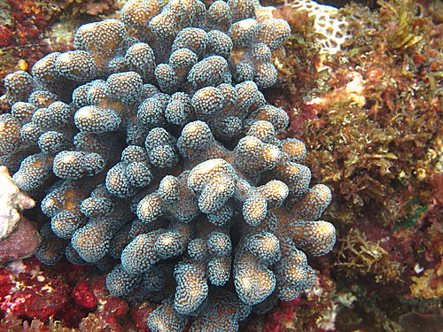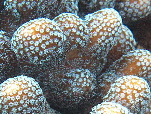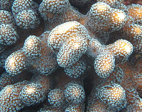 形態特徵: 群體的分枝呈圓柱形,頂端圓鈍,分枝的大小,在同一群體內相當一致橫截面呈圓形。群體的形態變異很大,分枝的粗細和疏密,皆隨生長的環境而異。生活在海流較強勁的環境中者,分枝粗短而密集;生活在海流較弱的環境中者,則分枝較細長且排列疏鬆。廣泛分佈於印度、太平洋珊瑚礁區。
