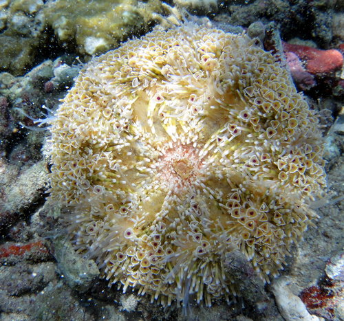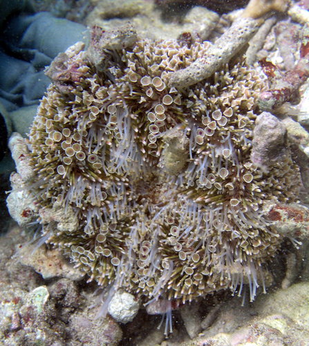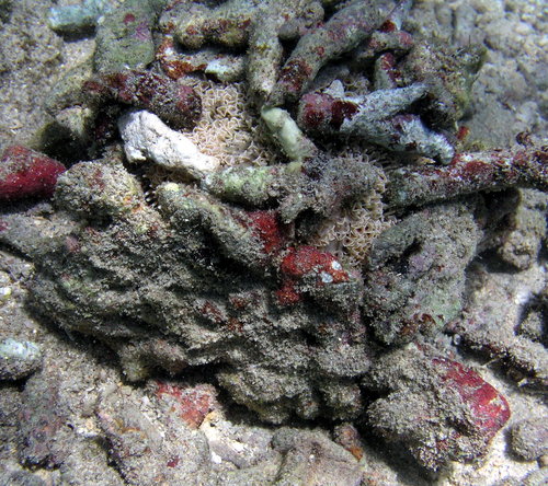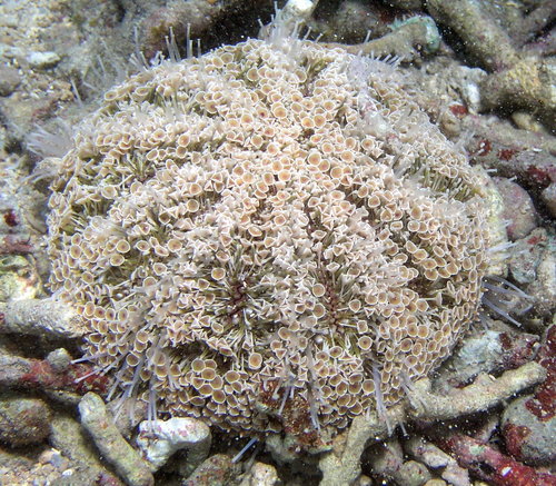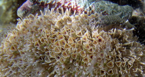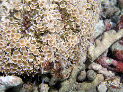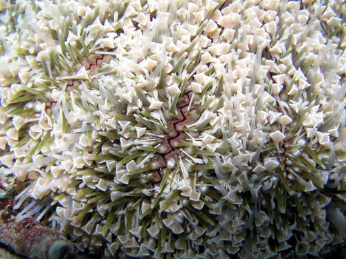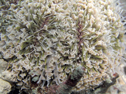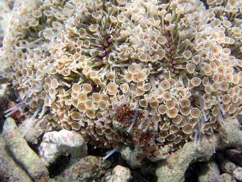 時常會以管足和叉棘捕捉藻類,死珊瑚或石礫掩敝其身。