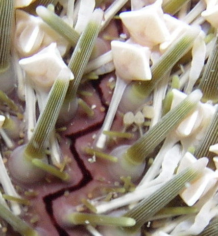 本種的體殼大但棘刺短,棘刺呈綠色,但末端有紫色環,刺尖為白色。