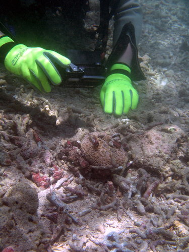 為海底最漂亮的一種大型海膽,此圖為此海膽與手的比例對比。