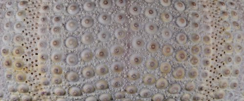 Sphaerechinus granularis, Lateral view, interambulacral area(間步帶區), Plating detail.