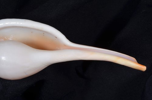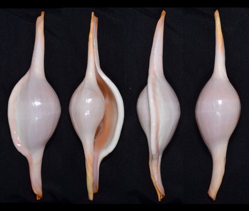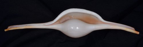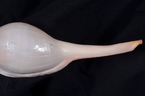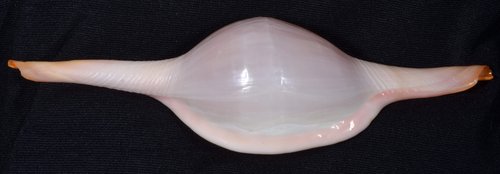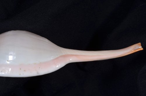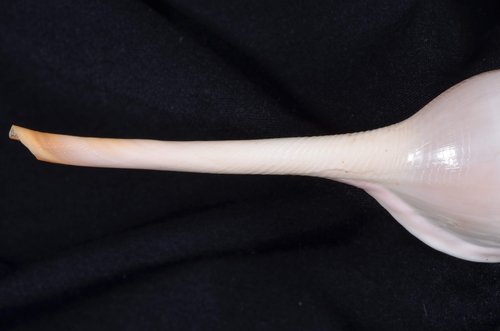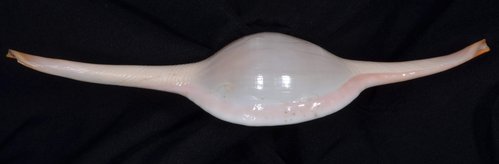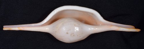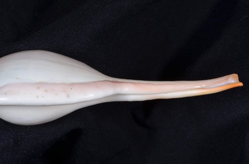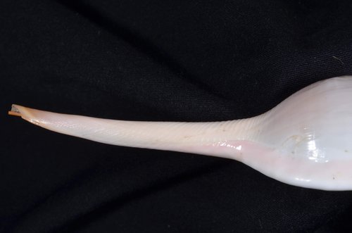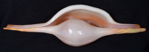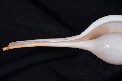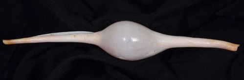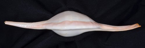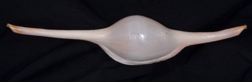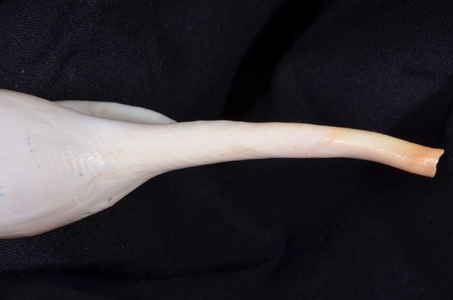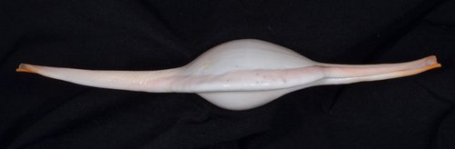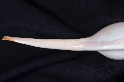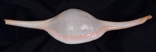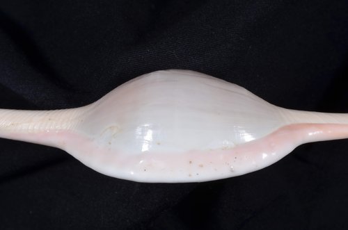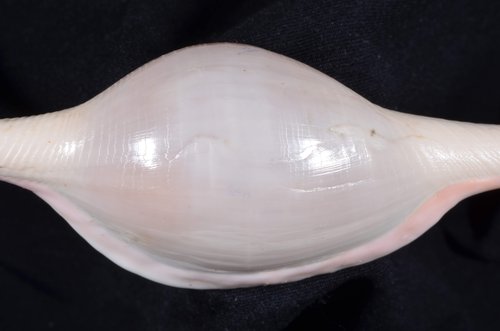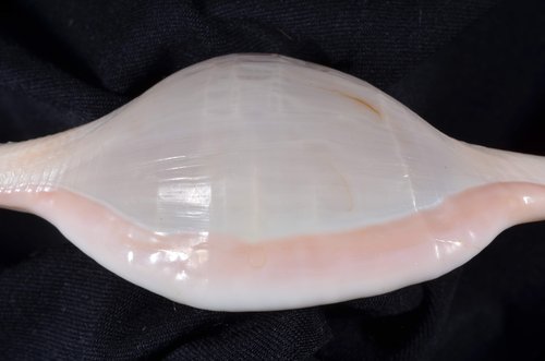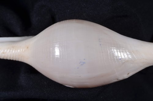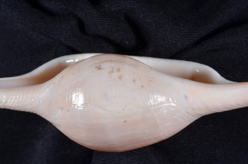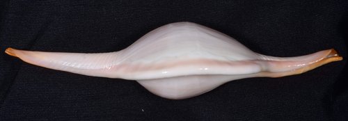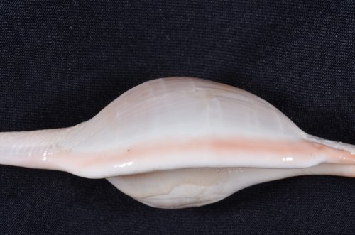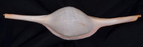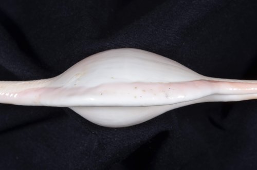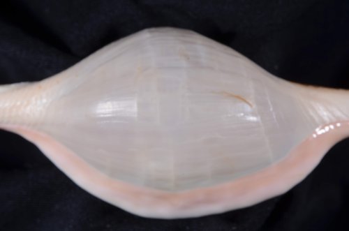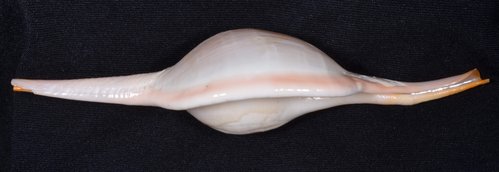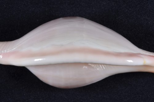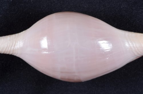 2. Volva cumulata兩端水管溝相對於中央螺體部而言並不顯得相當長,使中央螺體部顯得較卵形腫脹,腹面觀時其兩端水管溝向一方偏彎。