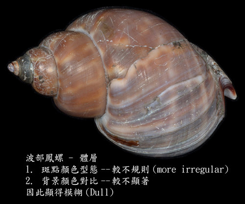 網路上有許多來自中國沿海標示為波部鳳螺的殼,幾乎都是霧花鳳螺,這也就是最常見的鑑定誤謬,霧花鳳螺與波部鳳螺真的是常讓人霧裡看花,而霧花鳳螺的形態又變化很大,有矮胖與瘦肉型,實在很難讓人相信它們是同種,後面還會繼續在我的部落格貼上霧花鳳螺的相關標本。